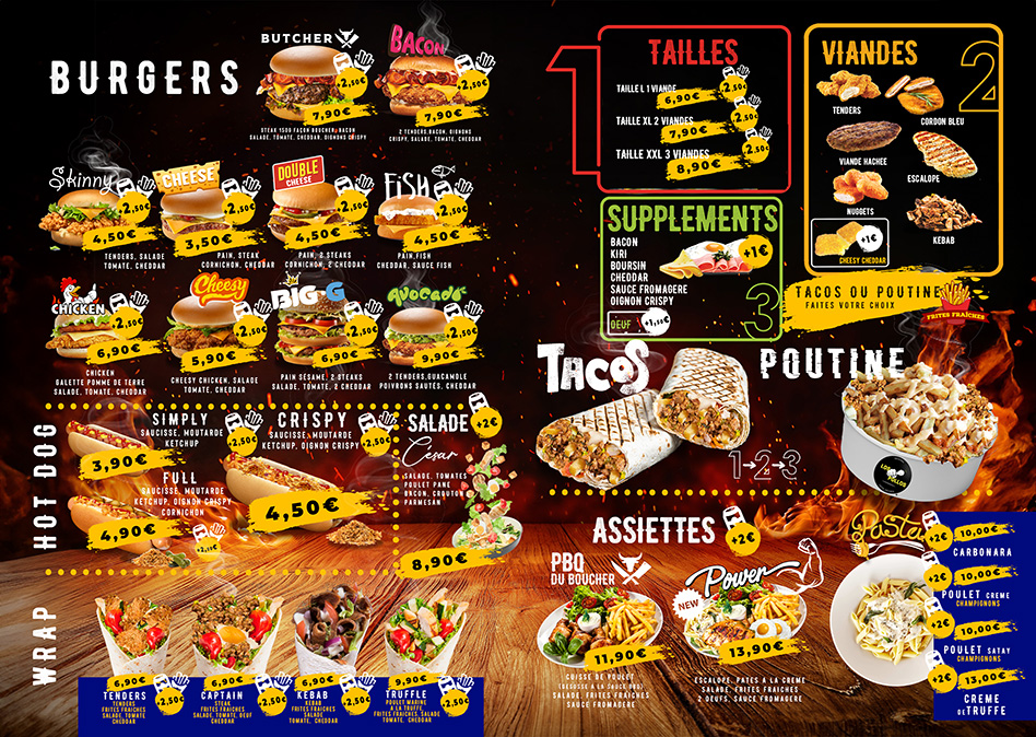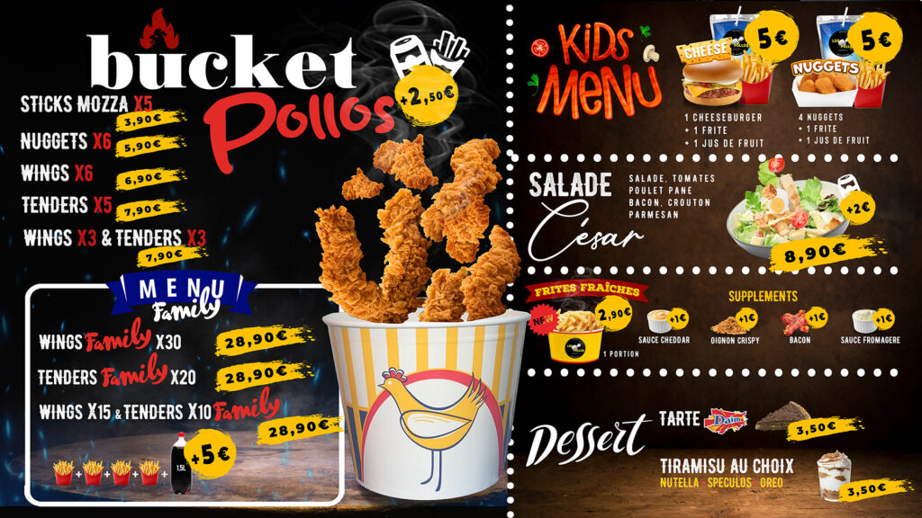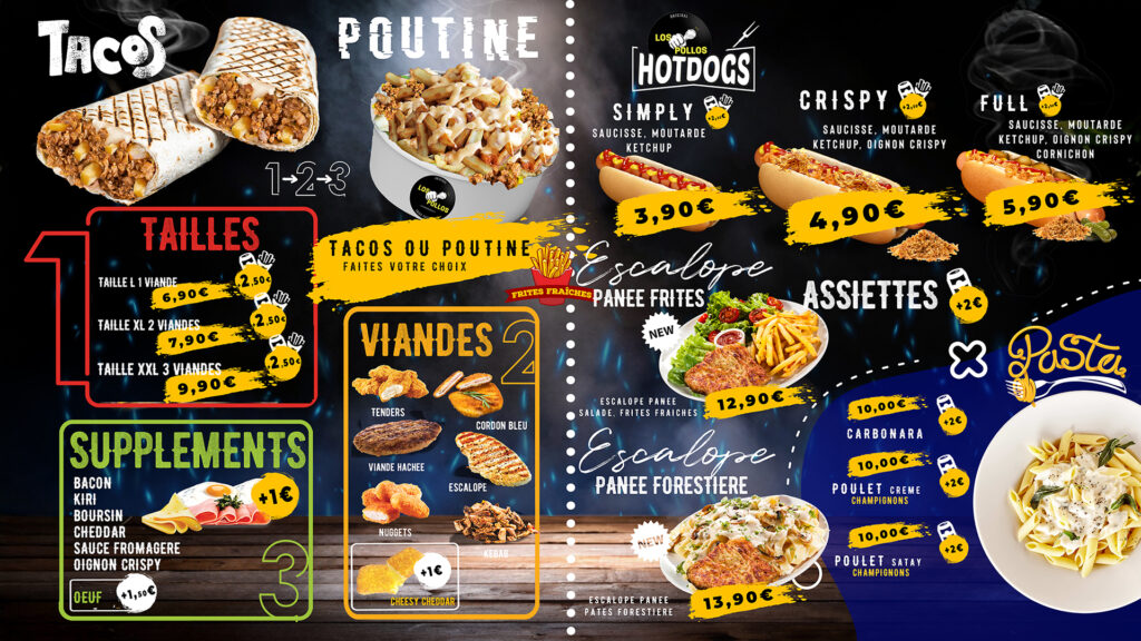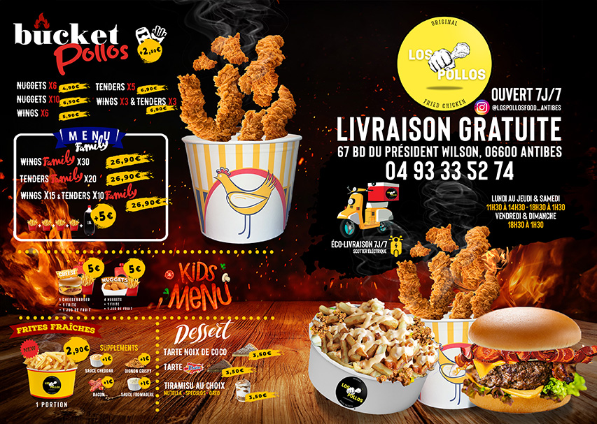 Nous avons accompagné Los Pollos Food à Antibes, dans une refonte complète de sa communication visuelle. Le logo a été revisité pour refléter une image moderne et percutante, tandis que l’ensemble des supports : flyers, dépliants, menus et boards TV et de l’intérieur